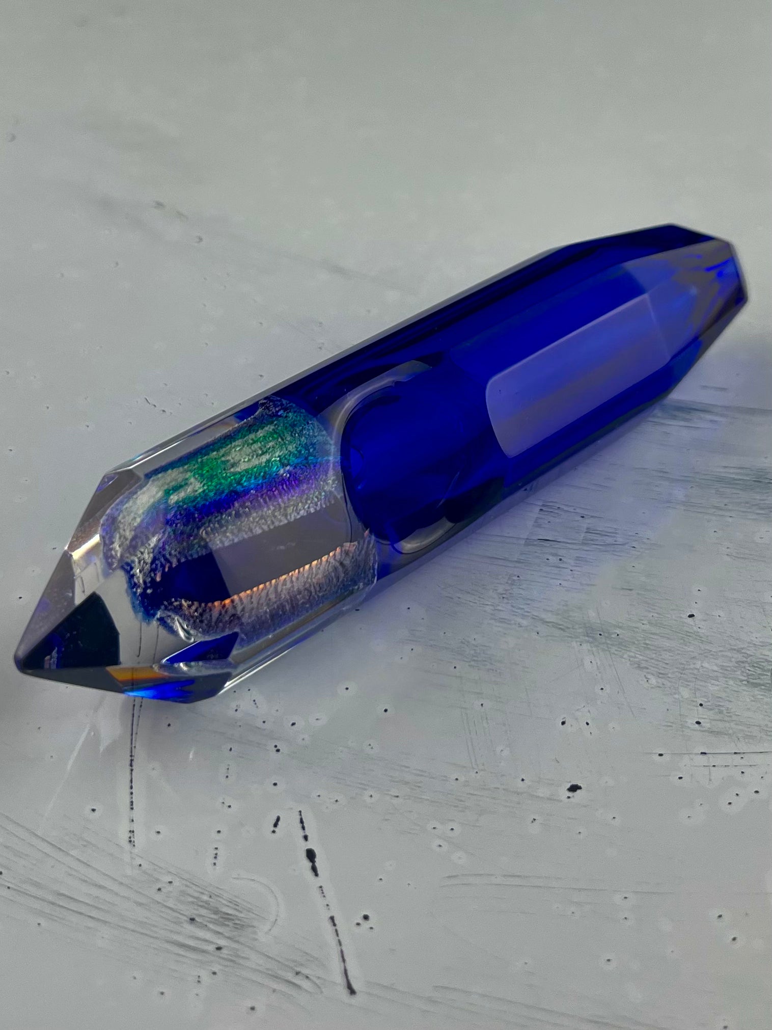 A very unique piece from the Atlantic glass shop. Mirror smooth facets, smooth beveled carb and stunning dichro make these great gift or addition to the collection!