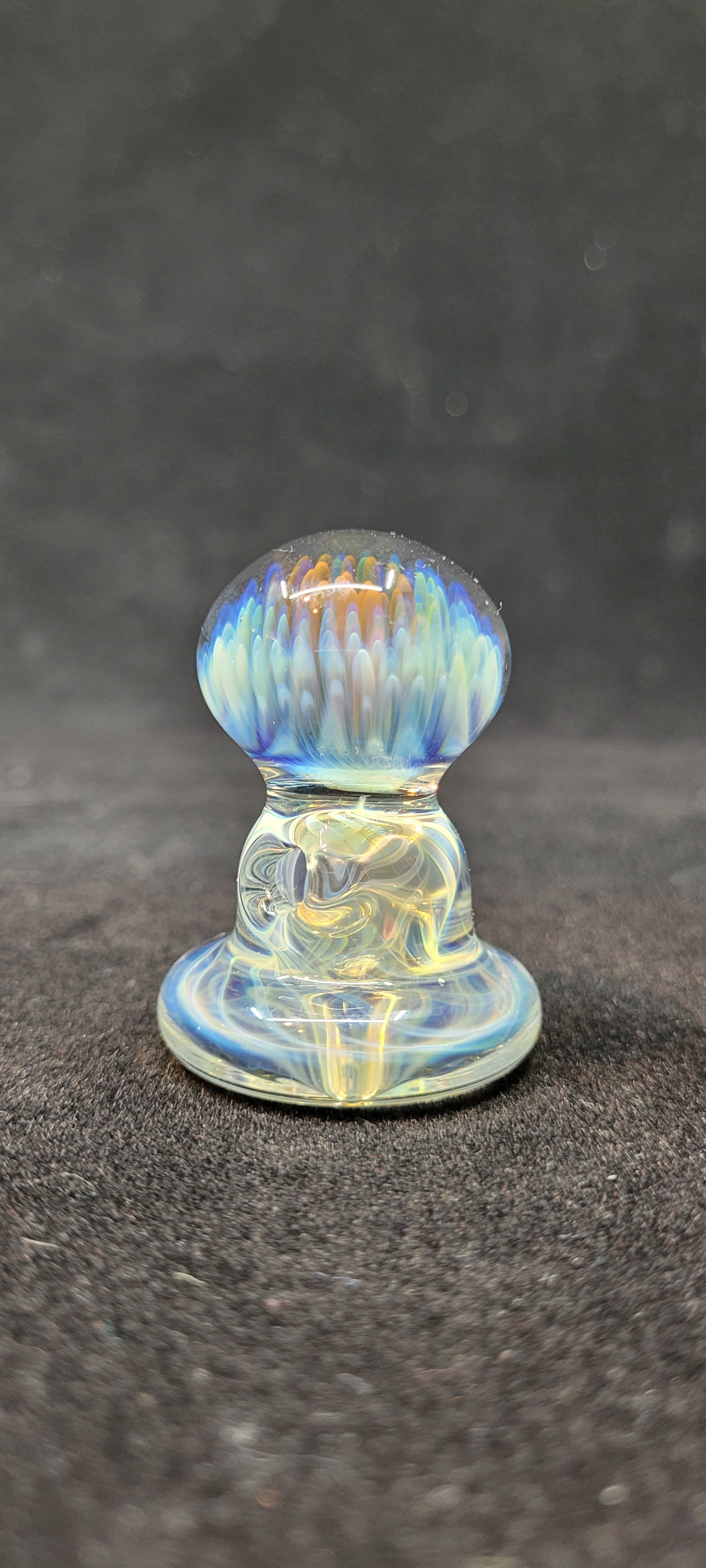 Maka B calls this amazingly silver and gold fumed carb cap a Candy Cap. The carb cap features a flattened implosion marble on top for the handle and a carb cap hole and chamber on the lower midsection. On the very bottom is the hole to the banger.