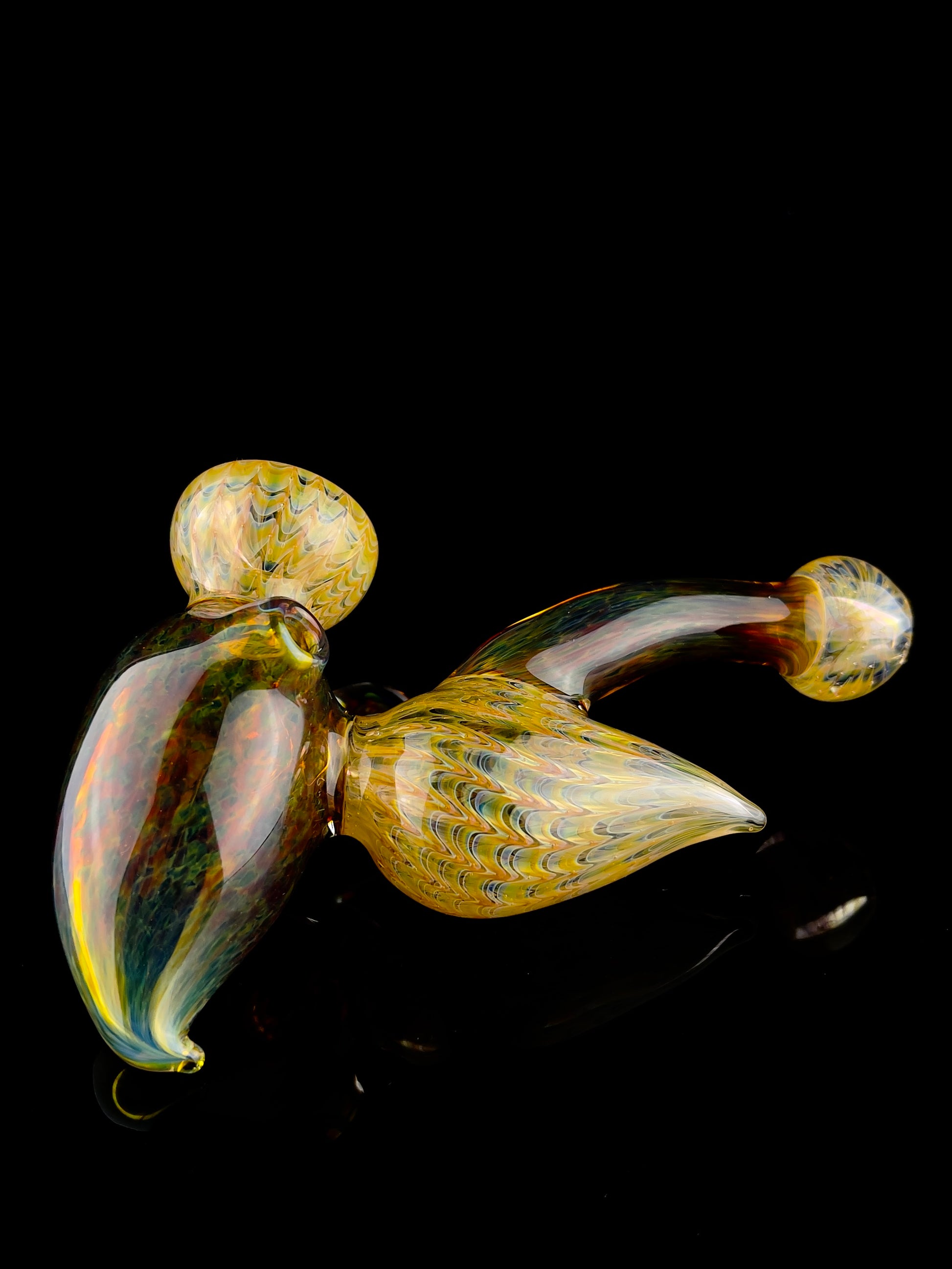Five sections of fume work and frit come together to make this unique little beauty! Features an implosion marble which can also function as a kickstand.