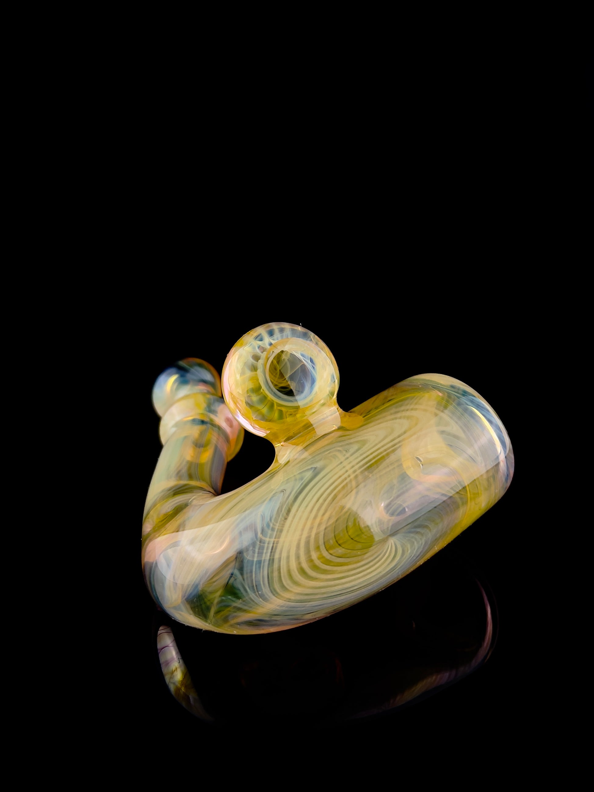 Who doesn't love a good Sherlock?.. And this one here's a beauty! Features heavy Gold&Silver fume work and a large kickstand marble. A large carb also ensures that you get an effortless clear every time leaving a fresh and clear path for your next puff! Measures approx. 4" long (from bowl to mouthpiece) and 3" tall.